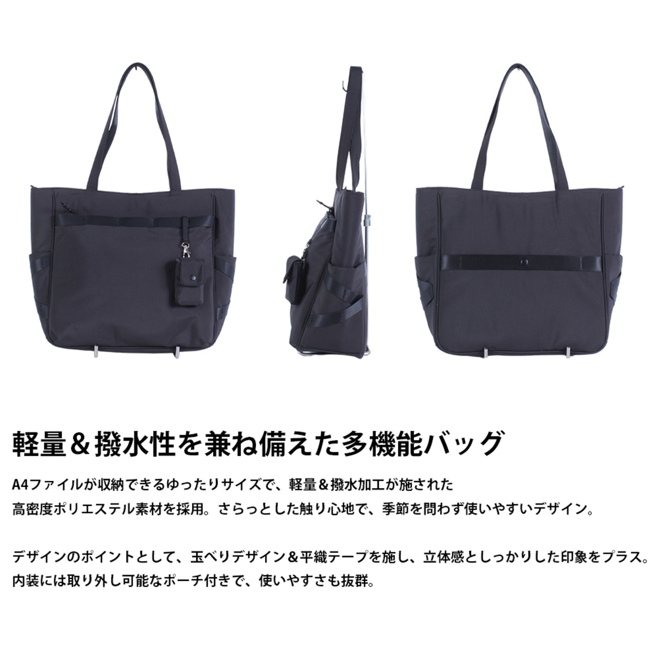 このトートバッグは、軽くて撥水性に優れたポリエステル素材を使用 このバッグは、軽量で雨にも強い撥水加工が施されたポリエステル素材を採用!